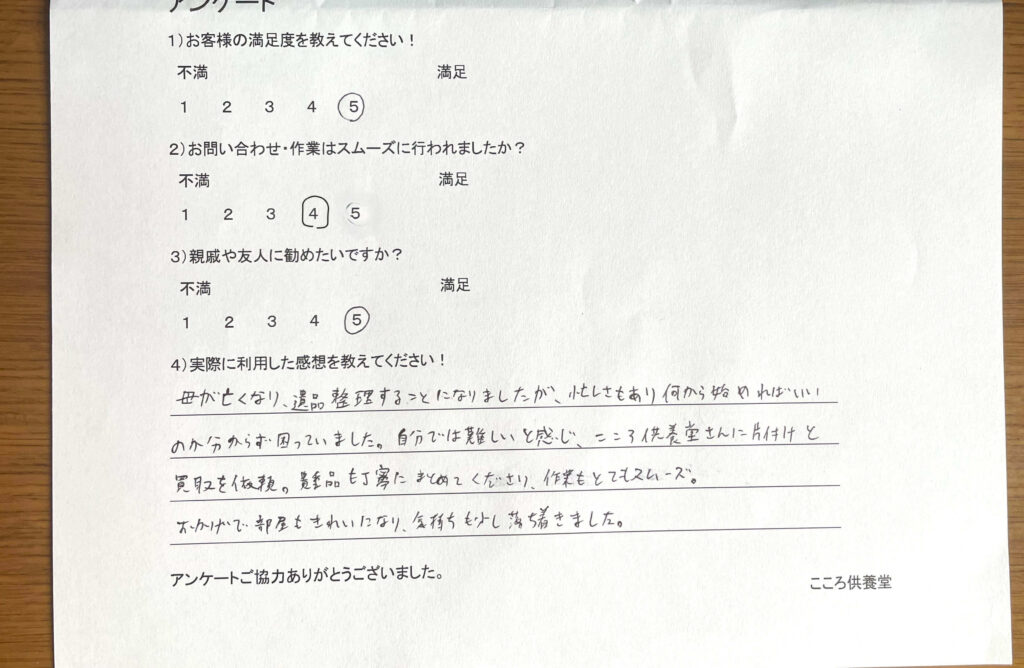 思い出の品も丁寧に扱っていただき、自分自身の心の整理にもなったと感じています。