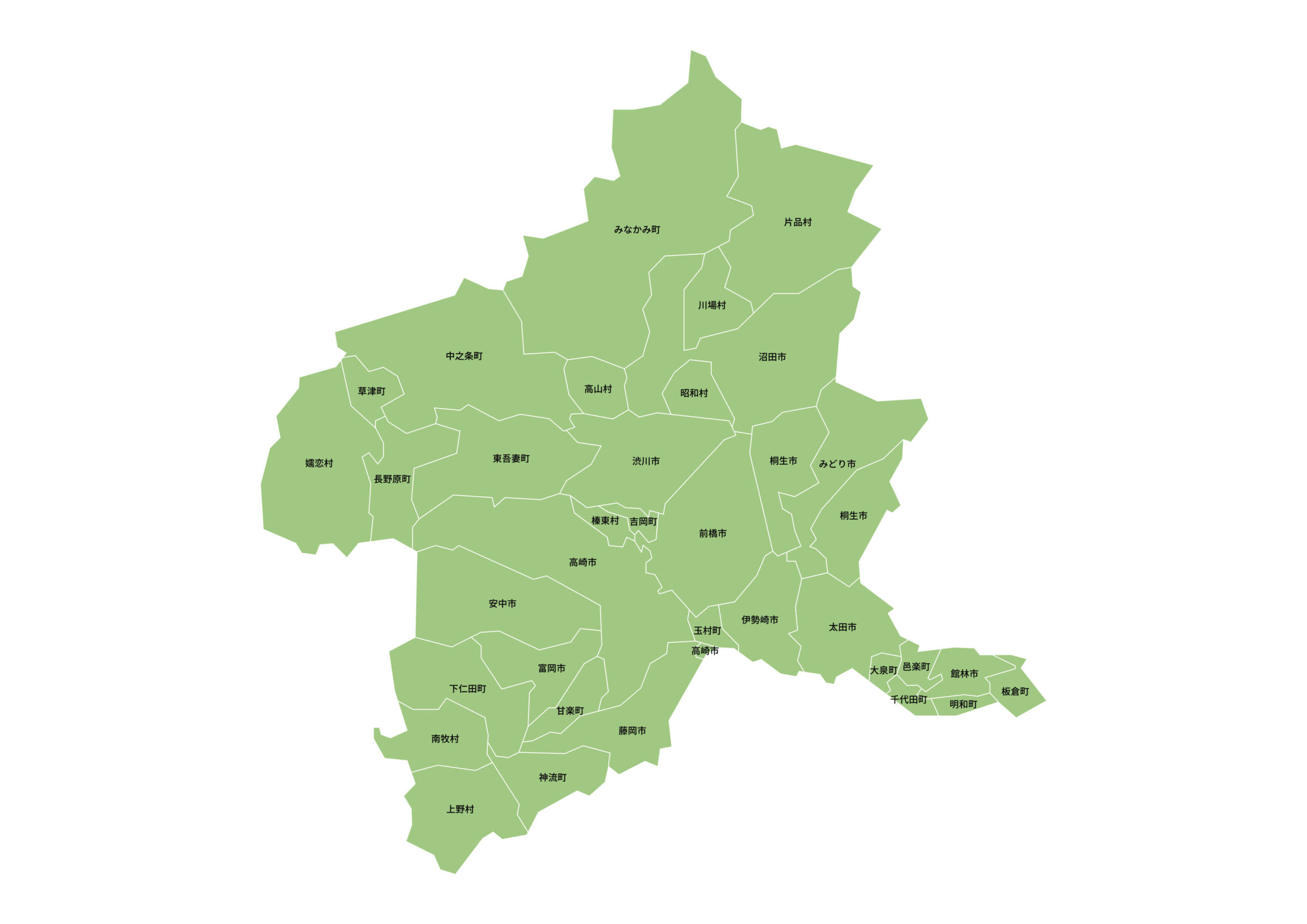 前橋市 / 高崎市 / 桐生市 / 伊勢崎市 / 太田市 / 沼田市 / 館林市 / 渋川市 / 藤岡市 / 富岡市 / 安中市 / みどり市 / 榛東村 / 吉岡町 / 上野村 / 神流町 / 下仁田町 / 南牧村 / 甘楽町 / 中之条町 / 長野原町 / 嬬恋村 / 草津町 / 高山村 / 東吾妻町 / 片品村 / 川場村 / 昭和村 / みなかみ町 / 玉村町 / 板倉町 / 明和町 / 千代田町 / 大泉町 / 邑楽町